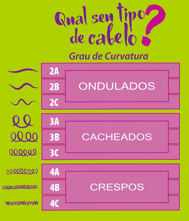 Os cabelos podem ser lisos ondulados cacheados ou crespos e para cada tipo de cabelo há variações quanto à espessura volume e brilho dos fios de cabelo. O tipo do meu cabelo é o 3c a minha grande dificuldade é deixar os meus cachos mais definidos e soltos quando ele seca uma parte enrola mais que a outra então fico muito incomodada com isso pois na frente os ficam bonitos já a parte de trás fica toda embolada. Eles são divididos da seguinte maneira.
